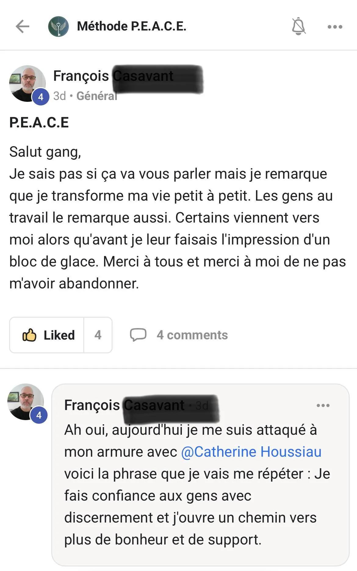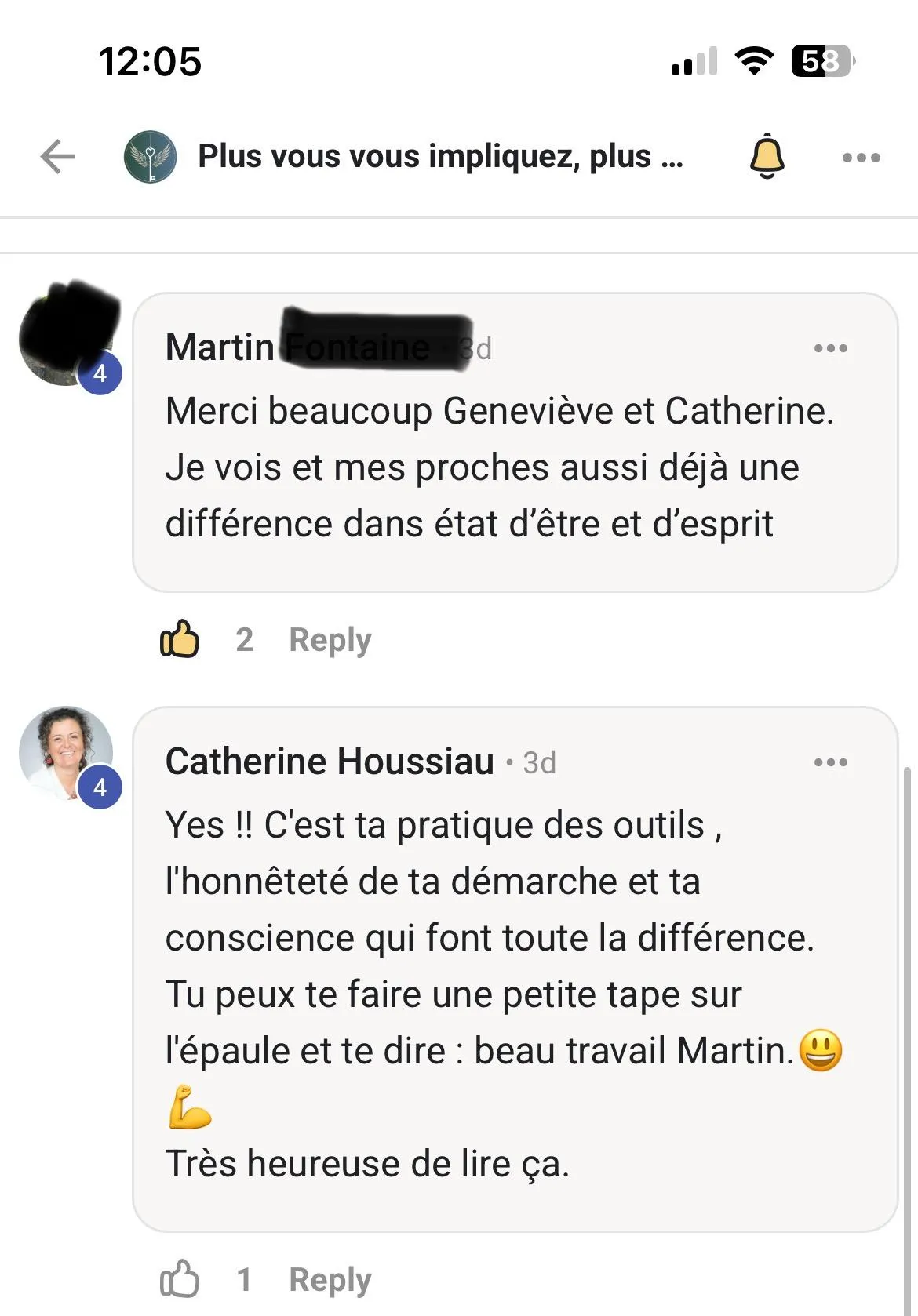 Depuis plus de 20 ans, elle accompagne les personnes pour les aider à se libérer des conditionnements qui les limitent, à agir au lieu de réagir, afin de faire des choix éclairés et développer leur potentiel pour donner du sens à leur vie. Catherine a à cœur d’accompagner des personnes dans leur cheminement vers plus de conscience et de liberté intérieure. Par sa présence bienveillante et accueillante, sa capacité d’écoute au-delà des mots et ses outils performants, elle met en confiance et sert de catalyseur pour aider à dépasser les blocages, à mieux gérer les émotions, à développer confiance et estime personnelle